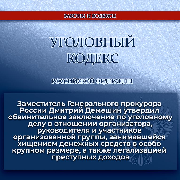Заместитель Генерального прокурора России Дмитрий Демешин утвердил обвинительное заключение по уголовному делу в отношении организатора, руководителя и участников организованной группы, занимавшейся хищением денежных средств в особо крупном размере, а также легализацией преступных доходов